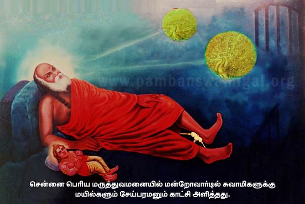 sreemath paamban suvaamihalukkuk kaatchi koduththa mayilhal siridhu siridhaaha maraiyath thodangina. indhak kaatchiyaik kandu suvaamihal kangalil aanandhak kanneer pozindhu azudhaar. pinbu tham padukkaiyil thammoadu oru sevviya kuzandhai paduththirukkak kannutrraar. vandhadhu muruhan yenru unarndhadhum avar thirunaamangalul onrinaip panmurai uchchariththaar. kaalil ulla murivu onru saerndhadhu.