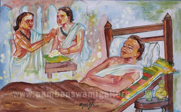 sreemath paamban suvaamihal ayarndhu thoongik kondu irundha samayaththil andha iravu kanavil azahiya thirumaenich saivar suvaami avargalai azaiththuk kondu aruhil ulla madaththitrku azaiththuch senru vaazaiyilaiyil annamum paalum ittu inippurap pisaindhu “anbanae! yennoadidhanai unbaayaaha” yenru anbudan kodukka andhach saivarum suvaamiyudan unavinai utkondaar. indha nihazchchikkup pin suvaami avargalukkup paadunj sakthiyum noolaaraaichchiyum adhihariththana.