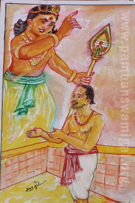 sreemath paamban suvaamihalukku vayadhu 41 irukkum poadhu oru vellik kizamai anru thuravara nilaiyai adaiya vaendum yenra yennam undaayitrru. anraiya thinam suvaamiyin nanbar thiru. angamuththu pillaiyidam “naalai naan pazanip padhikku sella ullaen” yenak koorinavudan angamuththu “meendum yeppoadhu varuveergal?”, “idhu kumaarak kadavul kattalaiyoa?” yenru vinavinaar. adhatrkuch suvaami avargal “aam” yenru koorinaar. anru maalai pazani muruhan thoanri “yenadhu kattalaiyenru yean poi koorinaar?” yenru koora suvaami avargal udal nadungi “yennappanae! yen kadavulae! nilam, pulam vizaindhu poi puhalavillai, aanmalaabam yeidha vaendumenbadhatrkaahavae avvaaru koorinaen”, yena manaththinaalaeyae vidaiyalikka, adhu therindhu konda perumaan, “andha ilaabam yennaal aahaadhoa?” yenru thiruvaai malarndharuli “ini yaan varuha yenru koorum varai pazanikku nee varavaendaam” yenru kattalaiyittu maraindharulinaar.
